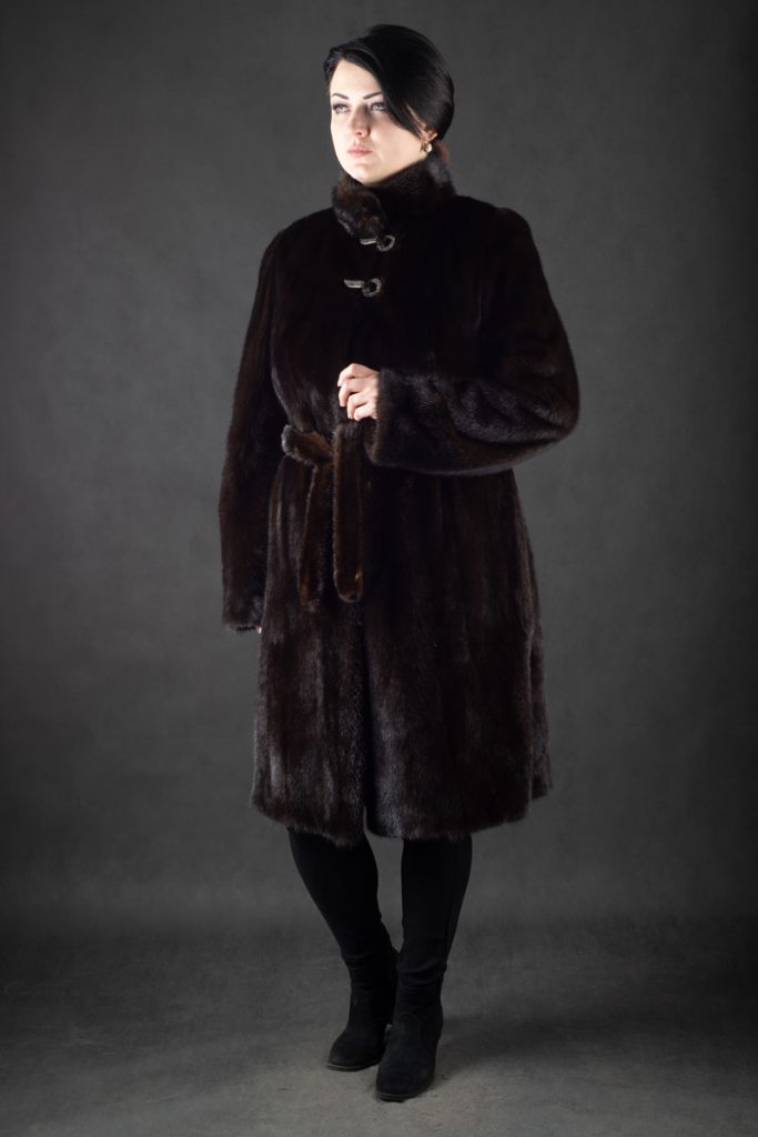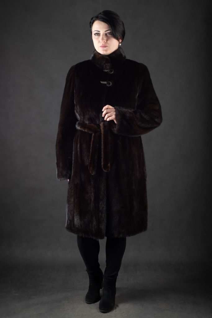 Пальто из меха норки, воротник стойка 2 пуговцы, пояс