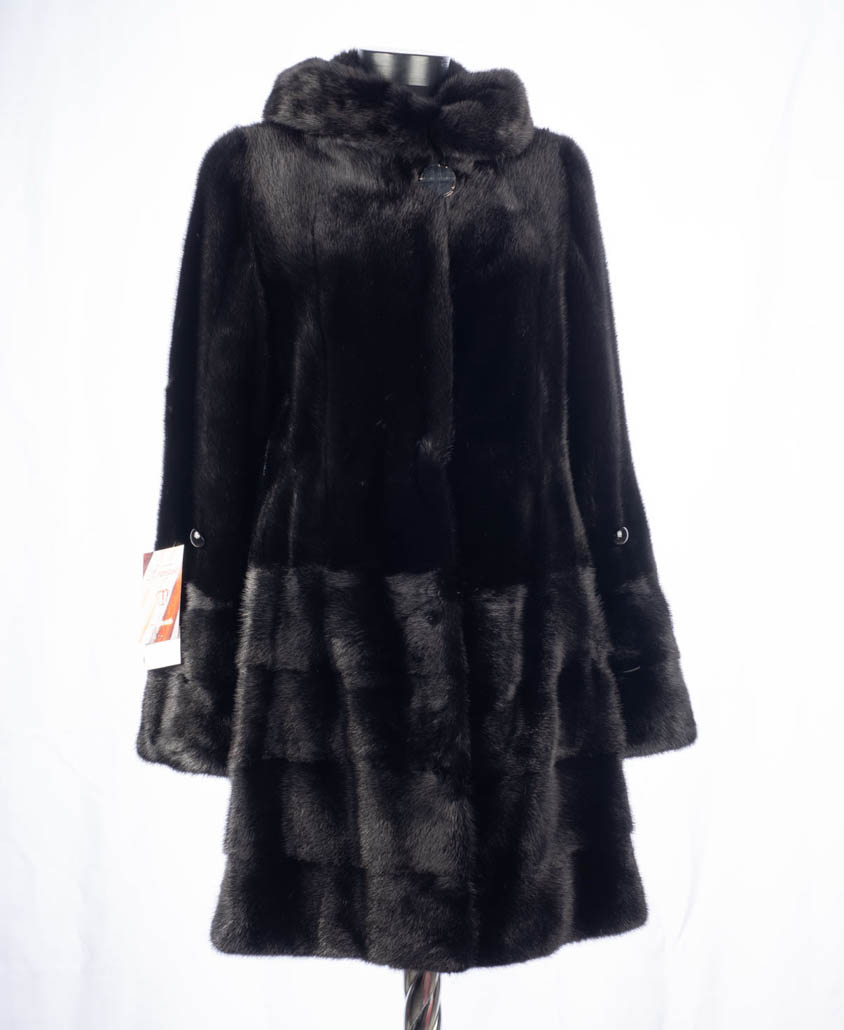 Пальто из меха норки с английским воротником и поясом, мех скан-блек